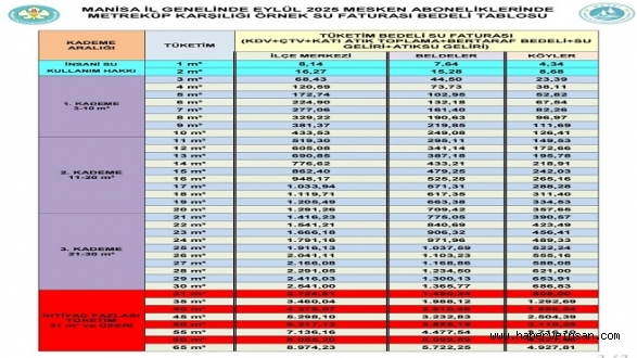 Mevcut yürürlükteki ücret tarifemize göre 1 Eylül itibariyle il genelinde konutlarda insani su kullanım hakkı olan ilk 2 ton su 1 TL, 1. Kademe 3-10 m3 28,75 TL, 2. kademe 11- 20 m3 50,30 TL, 3. Kademe 21-30 m3 75,43 TL, ihtiyaç fazlası kullanım olarak tanımladığımız 31 m3 ve üzeri 113,15 TL olarak uygulanmaktadır.