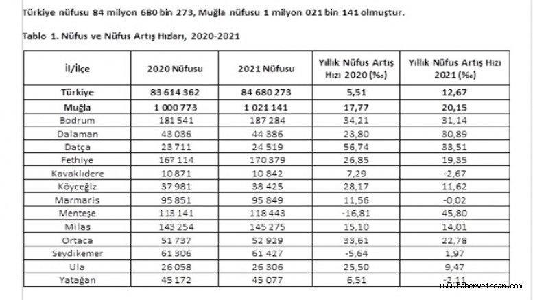 2021 yılında Muğla ilçelerinde en fazla nüfus artışının yaşandığı yer Menteşe ilçesi oldu. 2020 yılında nüfusu eksilen Menteşe 2021 yılında Binde 45,80 artış yaşadı. 2020 yılında 113 bin 141 olan Menteşe’nin nüfusu 2021 yılında 118 bin 43’e yükseldi. Menteşe ilçesini Binde 33,51’lik artış ile Datça, Binde 34,1 ile Bodrum, Binde 30,89 ile Dalaman, Binde 22,78 ile Ortaca, Binde 19,35 ile Fethiye izledi. Köyceğiz Binde 11,62, Milas Binde 14,01, Ula Binde 9,47 ve Seydikemer’de Binde 1,97 arttı.