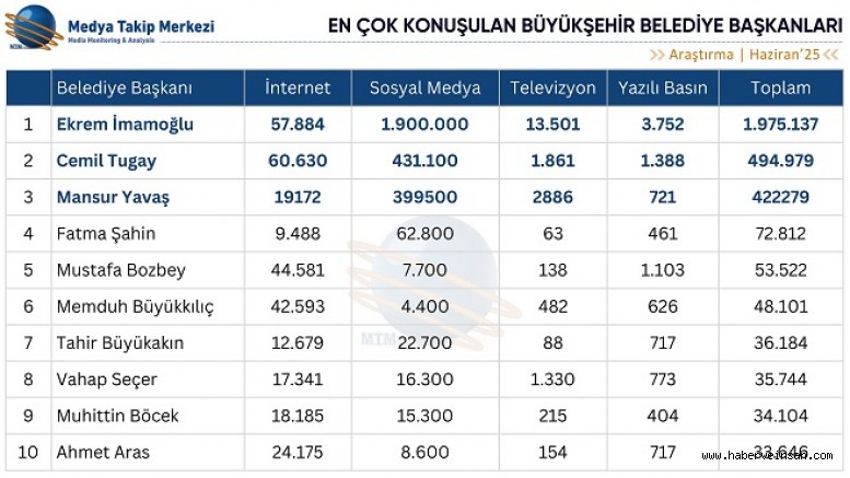Söz konusu dönemde Ekrem İmamoğlu, Cemil Tugay, Mansur Yavaş ve Fatma Şahin hem geleneksel hem de sosyal medyanın ilk dört sırasını paylaşarak kesişen bir medya başarısı yakaladı. Bu performans, söz konusu liderlerin çok kanallı iletişim stratejileriyle kamuoyunun ilgisini eş zamanlı olarak canlı tutma becerisini ortaya koyuyor.