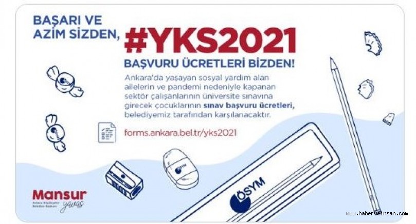 Başkan Yavaş, YKS başvuru ücretini ödemekte zorluk çeken ihtiyaç sahibi aileler ile kapanan sektör çalışanlarının çocuklarına sosyal medya hesapları üzerinden seslenerek, “Başarı ve azim sizden, #YKS2021 Başvuru Ücretleri Bizden” sözleriyle şu müjdeyi verdi: “Eşit eğitim, güzel bir gelecek her çocuğun hakkı. Sosyal yardım alan ailelerimizin ve pandemide kapanan sektör çalışanlarımızın çocuklarının #yks2021 ücretlerini karşılayacağız. Siz sadece hayal edin, çalışın ve başarın. Biz daima yanınızda olacağız.”