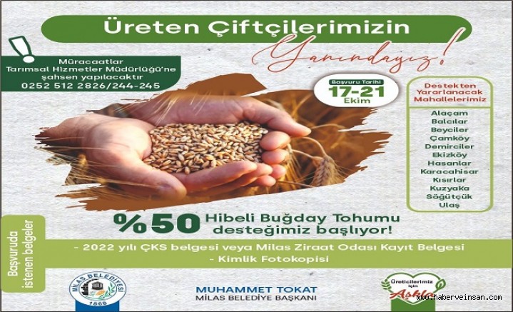 Toplumsal kalkınmanın bel kemiğini oluşturan tarımsal faaliyetlere verilecek her ölçekteki desteğin büyük önem taşıdığını belirten Milas Belediye Başkanı Muhammet Tokat, “Yaptığımız ön çalışmaların sonucunda 12 mahallede, 3 - 10 dönüm arasında toprağı olan yaklaşık 400 kişiye 60 ton buğday tohumu dağıtmayı hedefliyoruz.