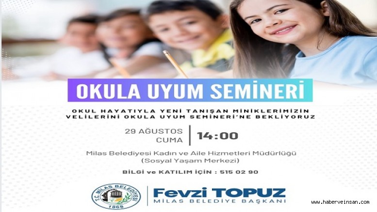 Yeni eğitim-öğretim döneminin başlamasına kısa bir zaman kala eğitim çalışmalarına hız veren Milas Belediyesi, okul hayatlarına yeni adım atacak olan okul öncesi ve ilkokul 1. sınıf öğrencilerinin velilerine yönelik ‘Okula Uyum Semineri’ düzenleyecek.