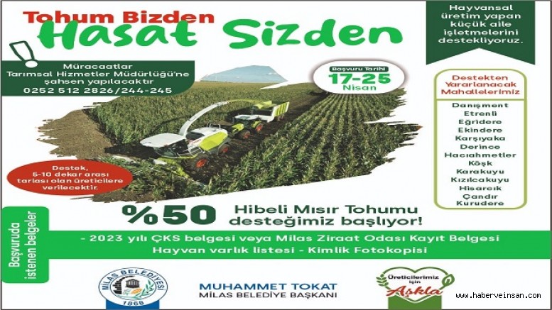 Tohumu desteğinde bulunacak. 2023 yılı Çiftçi Kayıt Sistemi (ÇKS) veya Milas Ziraat Odası kayıt belgesi, hayvan varlık listesi ve kimlik fotokopisi ile şahsen yapılacak başvurular sonucunda desteklemede bulunulacak.